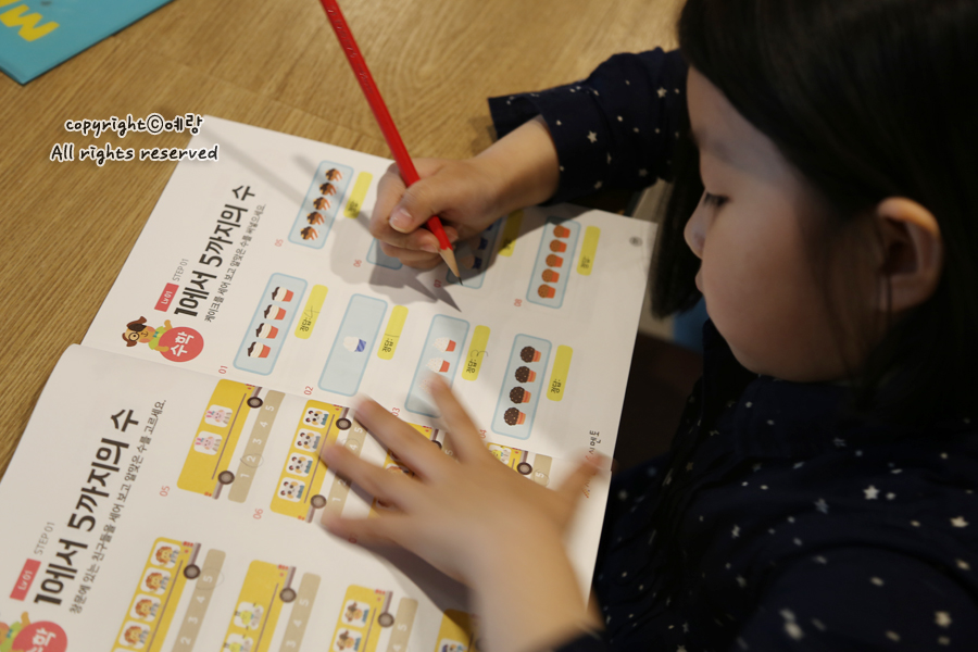 1~5까지의 수세기... 뭐 요건 그냥 술술 하고 넘어가야죠. 하루에 10장도 거뜬히 해내겠어요. ㅎㅎ 울 딸랑구를 넘 과소평가하고 첫단계를 시켰나봐요. ㅎㅎㅎㅎ